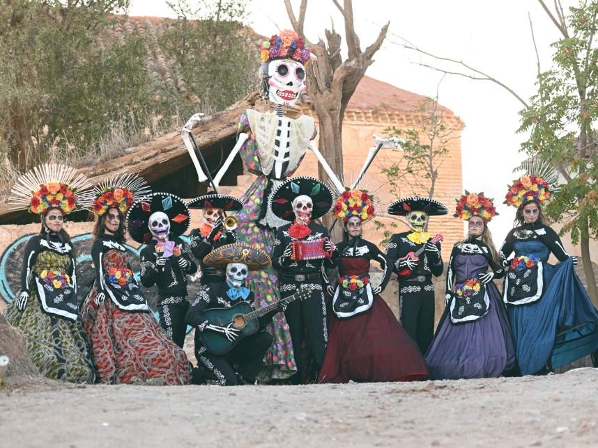 Las Catrinas son figuras emblemáticas de México, especialmente asociadas al Día de Muertos, que representan la muerte de forma elegante y satírica. Si buscas un pasacalles animado lleno de coreografías y color … ¡Mariachis y Catrinas es tu pasacalles! ¡Los bailarines más espeluznantes y divertidos han llegado con su espectáculo de música y bailes! Además es un espectáculo que se disfruta por igual por el día por sus coloridos trajes, como por la noche, con su iluminación incorporada en trajes y en la calavera hinchable que acompaña al carro musical. Además aporta más espectacularidad con nuestra catrina gigante de más de 3 metros.